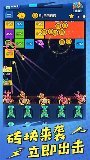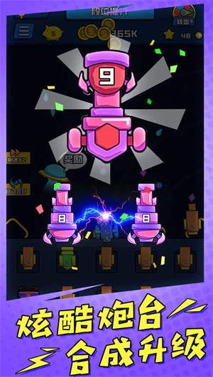 通过获取竞技金币可以解锁高端炮塔,这些炮塔具备无尽的摧毁能力。在竖向布局的界面里,仅保留着小数字方块,它们以极速的方式被消耗。