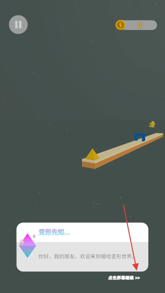 进入场景后,会出现一个漂浮的提示框,点击屏幕即可关闭提示并继续。接下来请将注意力集中在轨道上的三角形物体上,这是为后续的变形和移动操作做准备,以便推进游戏进程。