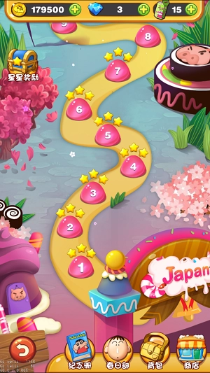 《蜡笔小新连连消》是一款经典的消除类休闲益智游戏,以超人气动漫《蜡笔小新》为创作灵感。游戏画面精致细腻,搭配轻快愉悦的背景音乐,玩家只需消除相同颜色的糖果即可积累积分,积分越高,通关后解锁的奖励就越丰厚。喜欢的话就赶紧来挑战吧!!