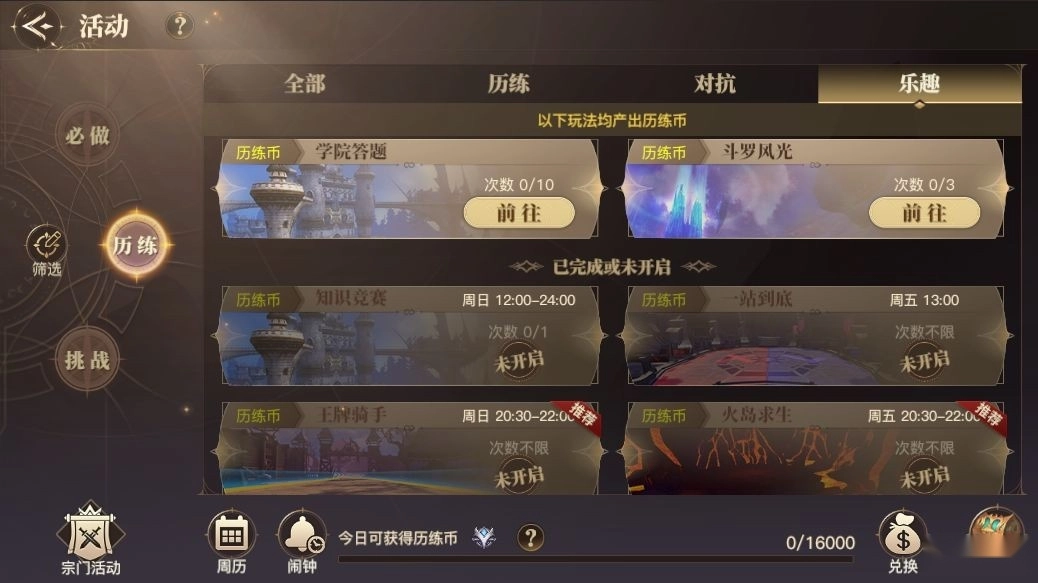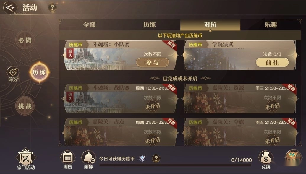 除去每日必做任务,日常任务还有我们历练活动。历练活动有历练币,每日历练币都有上线,如何来决定做什么日常呢?我们可以先来看看历练活动的分类。