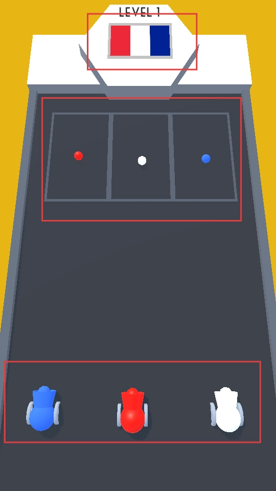 观察关卡顶部旗帜的颜色分布情况,从下方挑选出与旗帜颜色相匹配的容器,为接收小球做好准备。