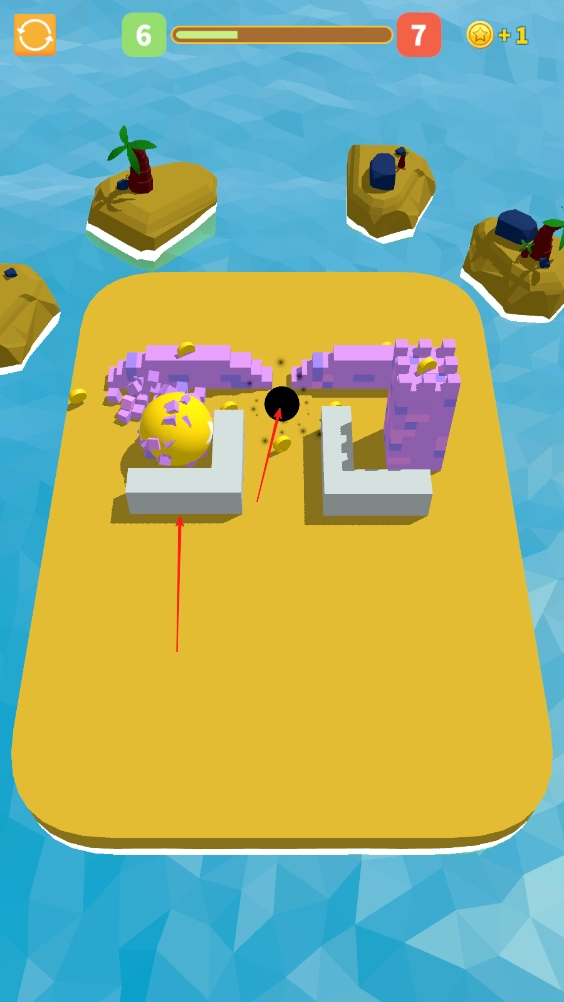 用小球去撞击完好的建筑,建筑会一碰就倒塌碎裂,然后滚动小球去黏附地面上散落的碎片,等把所有碎片都黏干净了,就能顺利通关。