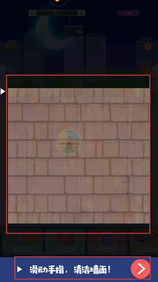 按照提示滑动手指,在墙面上反复擦拭,去除砖块上的污垢,让墙面展现出新的面貌,从而完成清洁任务。