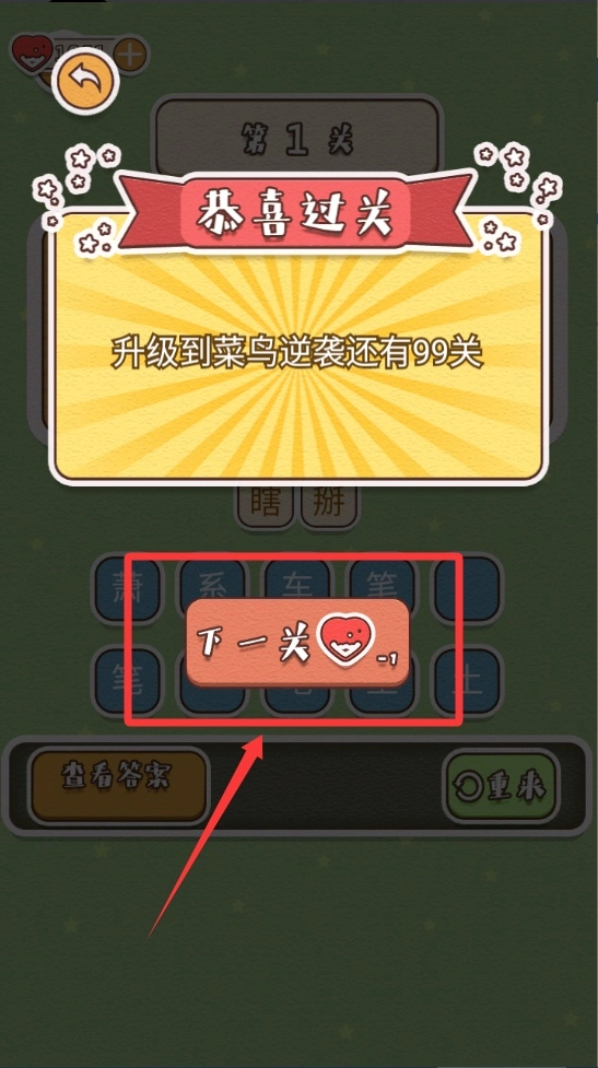 成功闯过当前关卡后,点击闪烁的“下一关”按钮,题目难度会逐步增加,以此来挑战您的知识储备和反应速度。