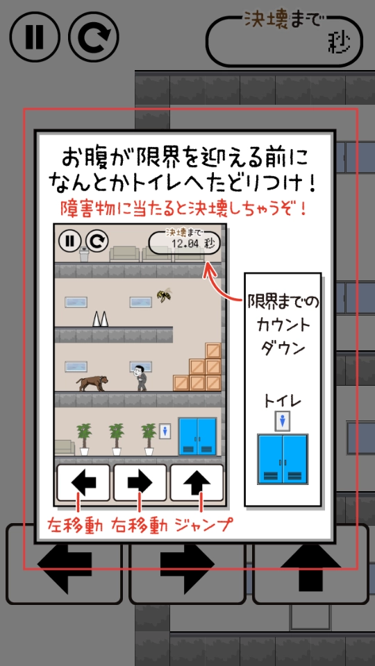 你需要操控角色进行左右移动和跳跃,躲开场景里的各种障碍,还要时刻关注剩余时间,必须在规定时间内到达厕所。