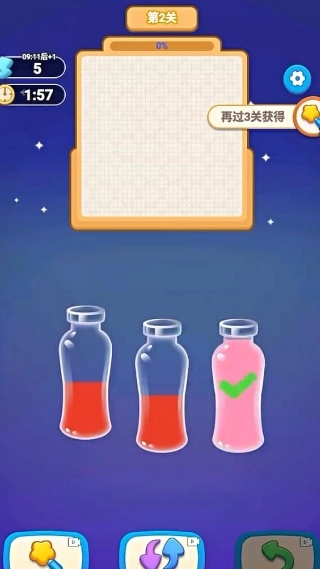 4、按关卡要求,在限定步数或时间内消除指定颜色液滴,或清空所有试管,完成挑战解锁新关卡。