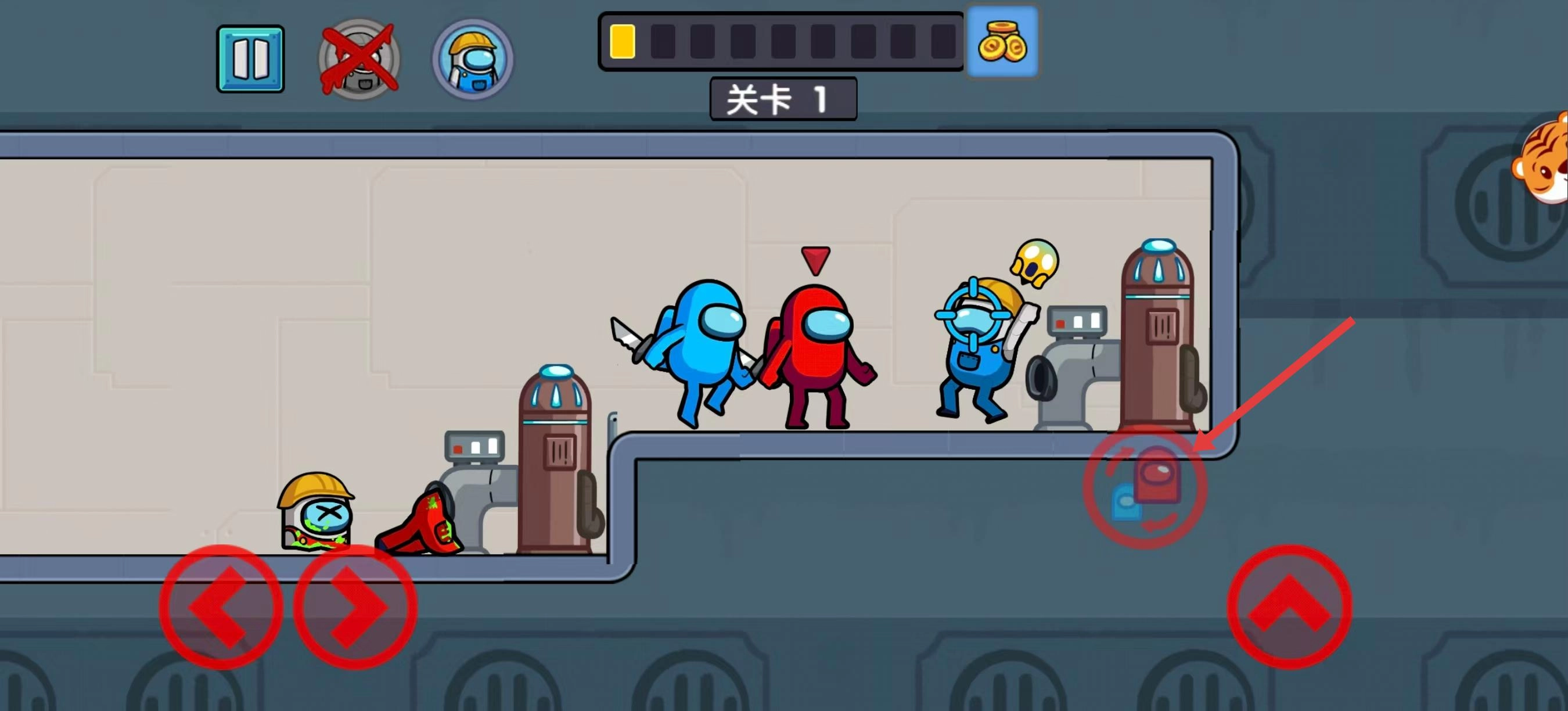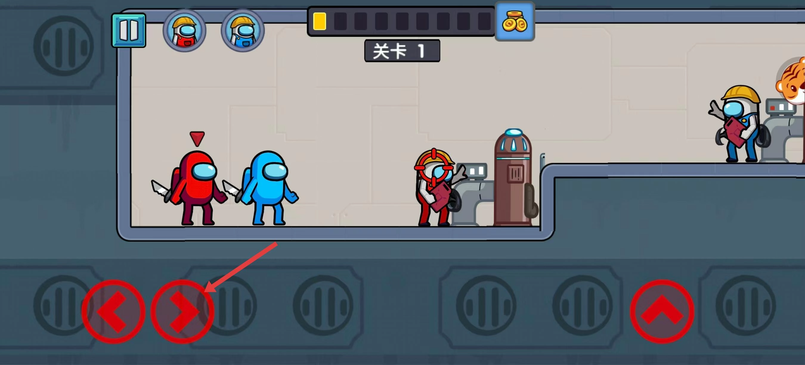 在关卡1里,你需要操控红色与蓝色的小人,点击下方的箭头按钮,就能让小人在场景里移动,靠近其他角色,为互动或者对抗做好准备。