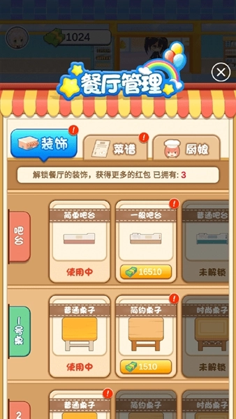 1、解锁更多不同类型的菜谱,烹制更多可口的美味佳肴,研发新的菜品以提升收入;