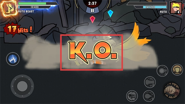 4、持续输出直到触发【K.O.】提示,成功战胜对手,推动游戏进度。