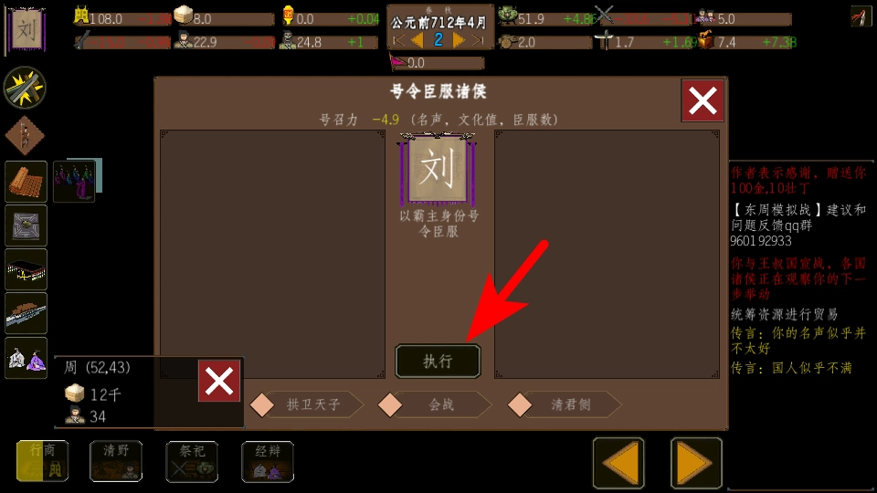 进入游戏后,点击箭头所指引的执行按钮——这是触发号令操作的关键步骤,点击该按钮后便能推进势力臣服的流程。