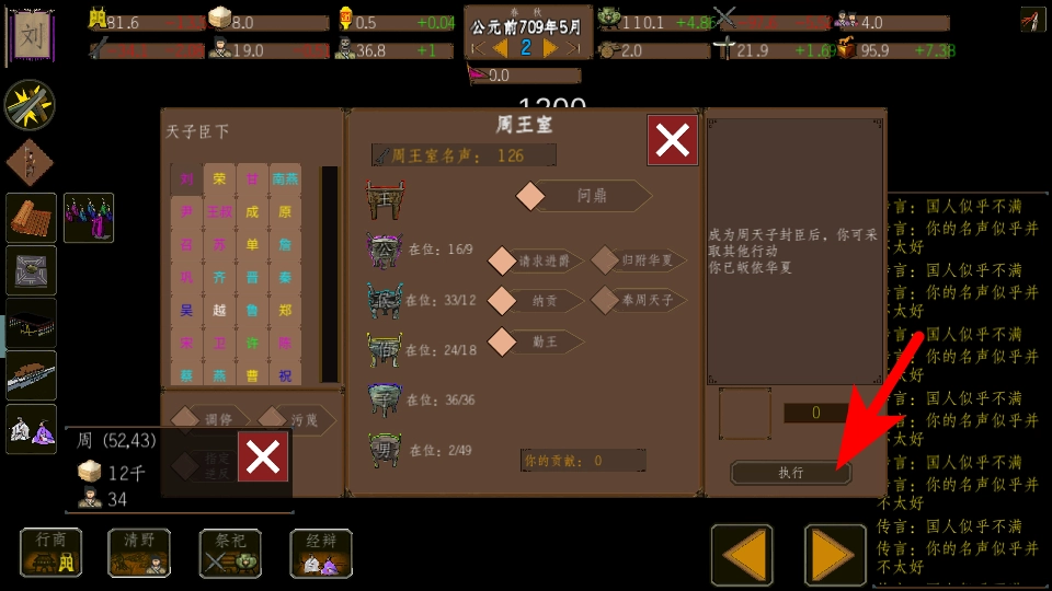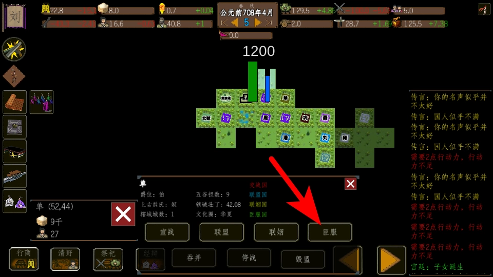 4、点击箭头所指的功能选项,这是实现诸侯臣服的必要步骤,按照指引操作就能完成与对应势力的互动。