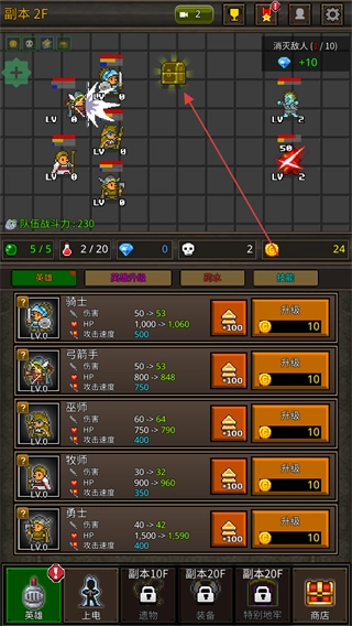 1、在副本2楼,控制英雄移动到金色宝箱的位置,领取宝箱奖励。