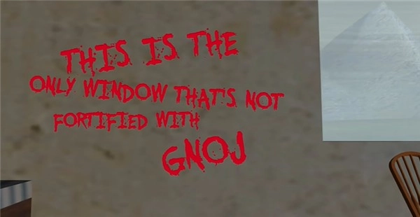 3、画面一转,我们来到室内,根据墙上的提示,我们需要打破旁边的窗户。