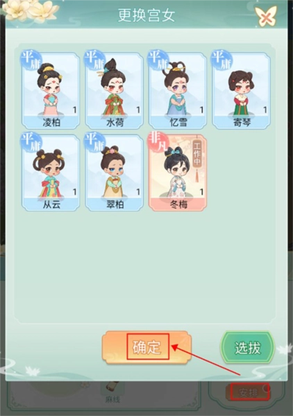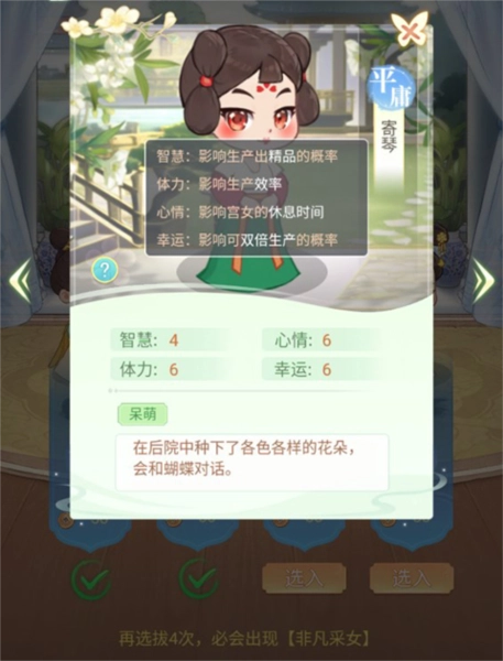 玩家点击右下角的“选拔”按钮,即可开展采女选拔工作,从中挑选合适的采女入宫任职。