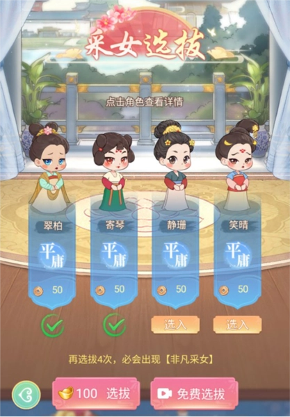 玩家可以点击采女查看信息来选择好采女。