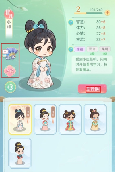 完成采女选拔后,角色便会成为宫女。玩家可在宫女页面查看她们的详细信息,同时还能浏览专属故事与立绘。