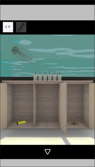 用望远镜望向厨房左侧窗外,看到海鸥以“高低低高高低”的规律飞行;接着前往地下室,找到按钮瓶;随后打开第三个柜门,获取十字阀门;将十字阀门安装到浴缸右侧的把手上,拧开阀门放水,浴缸溢水后,得到玻璃瓶与红色螺丝刀。