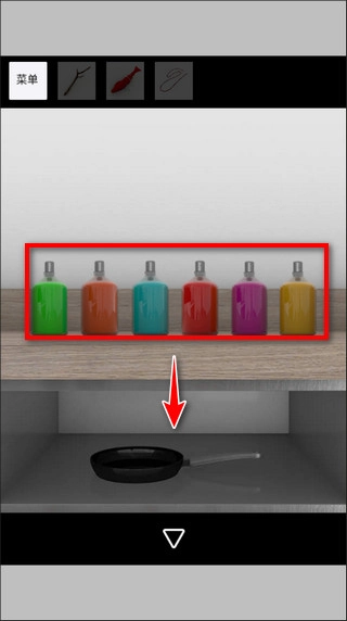按照高跟鞋的颜色顺序:绿、橙、蓝、红、紫、黄,去排列厨房的颜色瓶,完成排序后即可过关,获得平底锅并将其放置在厨房的煤气灶上。