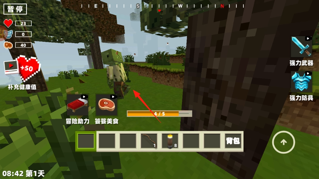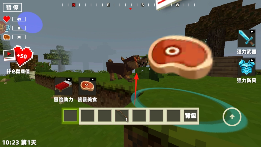 当遇到僵尸、野狼这类怪物时,可通过快捷栏使用弓箭发起攻击,同时要留意代表血量的爱心图标以及显示饱食度的牛排图标,一旦血量偏低就需补充健康值来恢复状态。