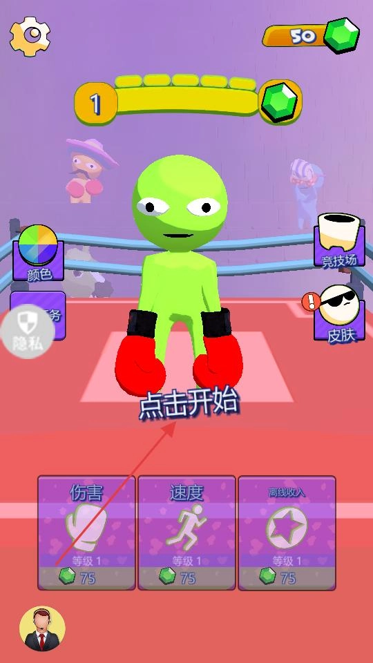 领取奖励后,回到角色界面找到那个绿色拳击角色,点击“开始”按钮,就能进入拳击对战的准备场景,一场竞技对决即将开启。