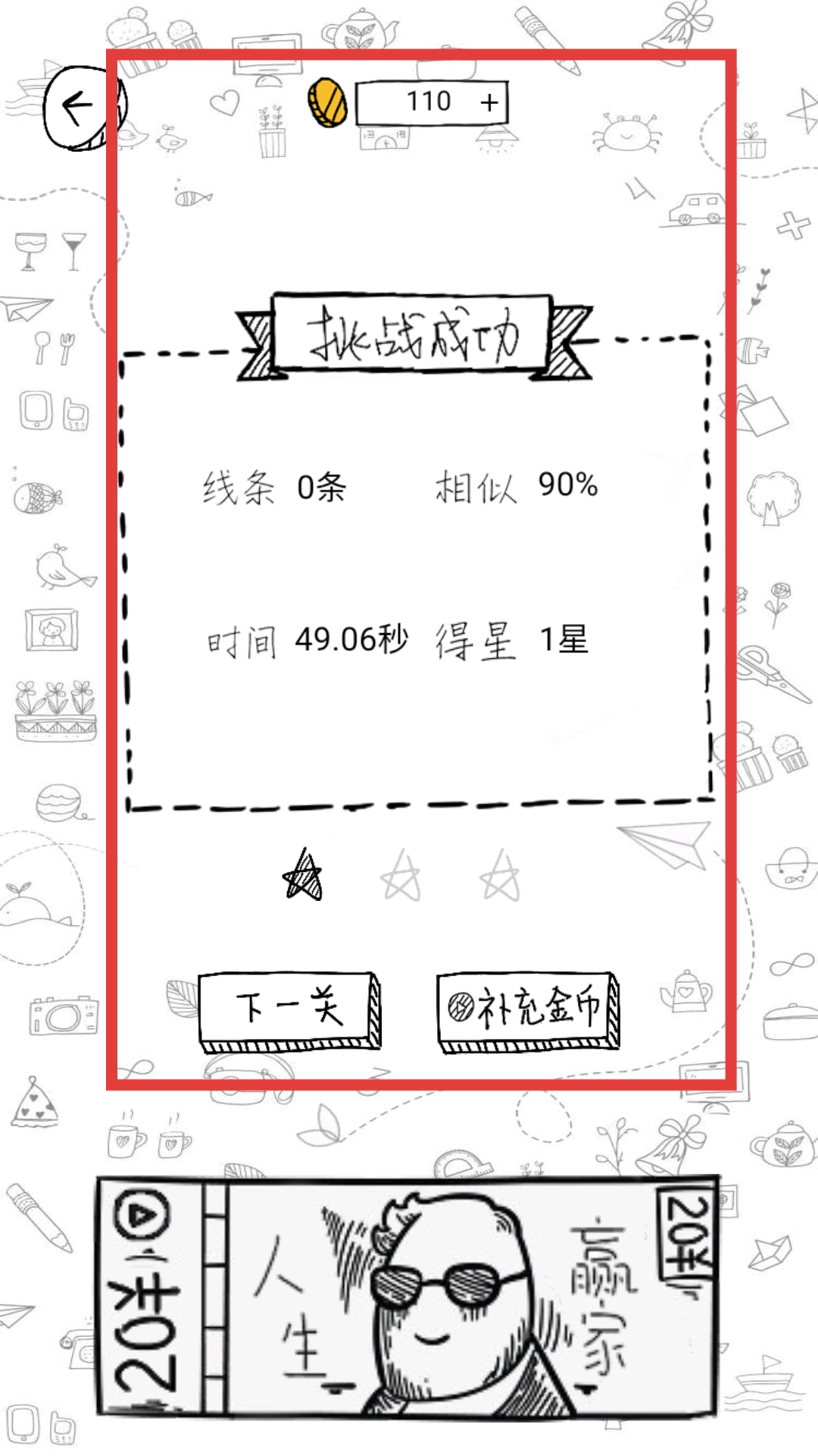 图案成功识别后,界面会弹出挑战成功的提示框,框内展示线条数量、图案相似度、通关时长以及获得的星星数量,提示框下方设有“下一关”和“补充金币”两个按钮。