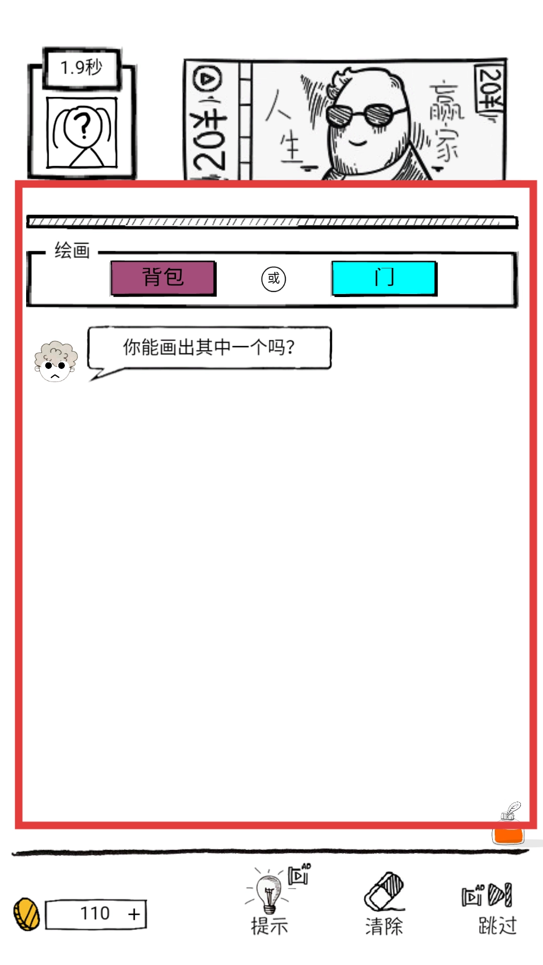 进入绘画关卡界面后,界面上方清晰显示着“绘画”字样,下方设有背包和门两个选项,角色还会发出“你能画出其中一个吗”的提示。
