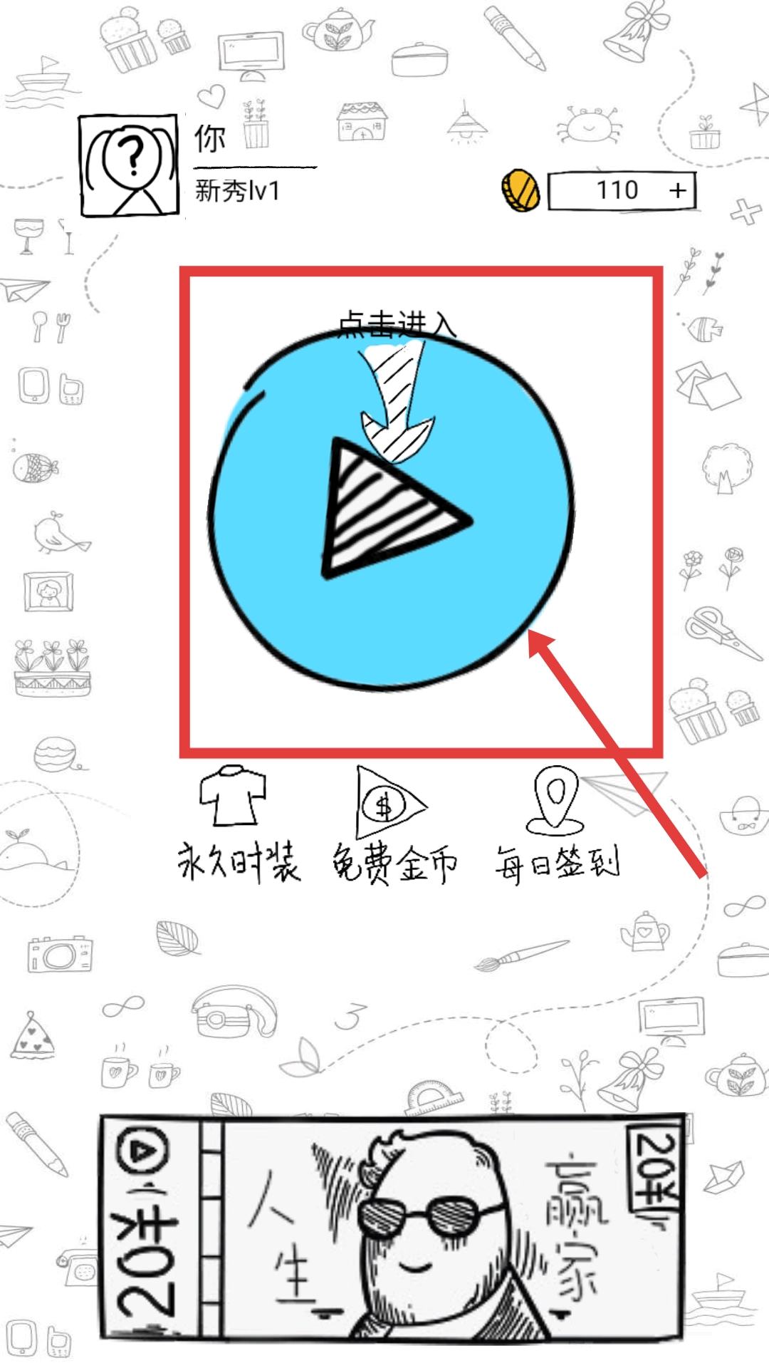 打开一笔一连进入主界面,界面中间有个圆形的播放按钮,按钮上方清晰写着【点击进入】的文字提示,接着点击这个圆形播放按钮,就能进入关卡界面。