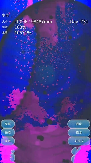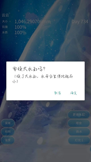 时间调到2026年后进行重置,喂足食物和水,再依次往后调整时间,终于把水母养得胖到转身都费劲。第二天游戏就提示需要更换大水缸,具体如图所示。