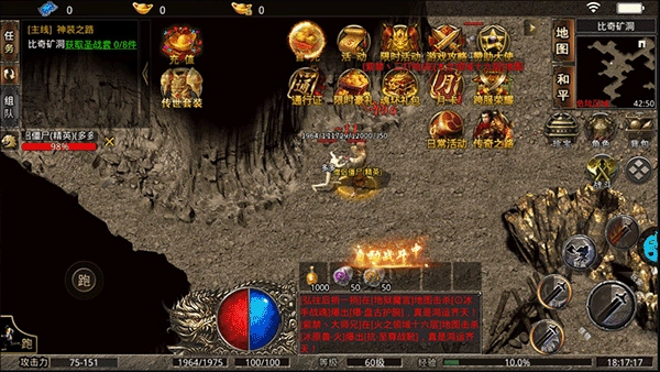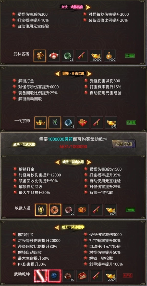 建议解锁第三档赞助“以武入道”,解锁后可获得自动回收和一键拾取功能,大幅提升打宝效率。接着领取全部奖励,使用经验卷升级至满足转生要求的等级,随后进行转生(注意不要将经验卷全部用完再转生),这样就能顺利达到7转。之后前往宝石镶嵌NPC处,将三颗宝石镶嵌到武器上,此时攻击可达到2000左右。再按步骤完成主线任务,青龙和白虎升到5级即可。主线任务完成后,前往石墓迷窟挂机,挂机时选择回收5转以下的全部装备。