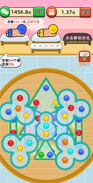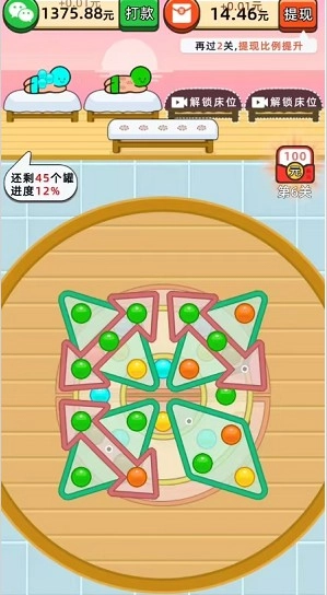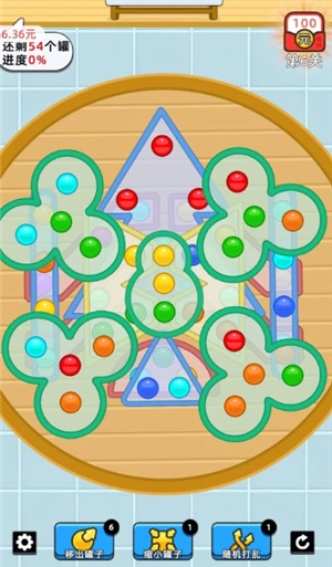 快乐养生堂采用了当下颇为流行的拔罐消除玩法,只需挑选三个和客人颜色相同的火罐就能达成消除,若能把所有火罐都顺利消除,就能通关获取红包,而且前面的几关相对容易通过,玩家可以直接试着挑战。