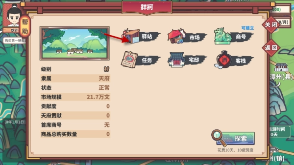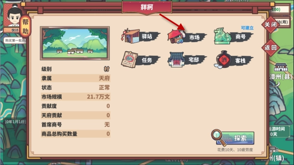3、接下来就能开启首次跑商了,点击城市里的市场,选购货物。