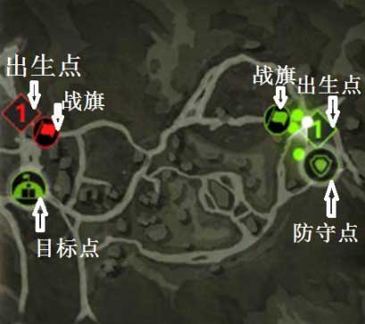 护旗战的获胜规则很简单,将战旗插到对方基地!如下图,双方的基地,复活点以及战旗获取点。