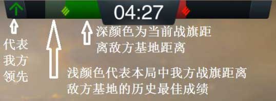 在界面的最上方,有一个推进进度条,深颜色部分表示当前战旗距离敌方基地距离,而浅颜色的部分,则代表在