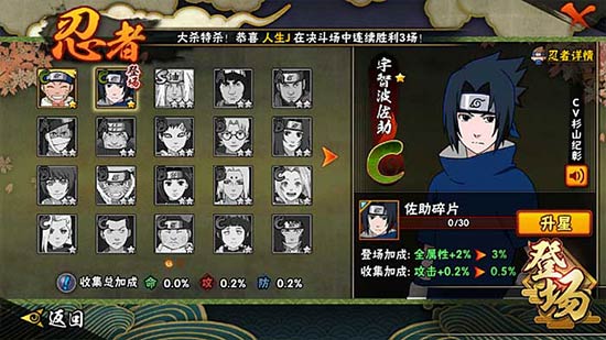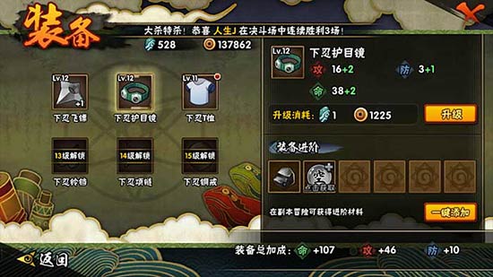 这款游戏忍者虽然多,但装备是玩家自身的装备,属性加成覆盖所有出战忍者,更重要的是,装备一解锁就自带,不需要搜集千奇百怪的装备,只需要给装备升级进阶即可。