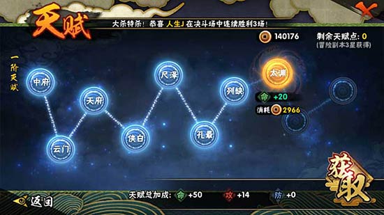 天赋系统增加的属性可以覆盖你所拥有的全部忍者,开启新天赋需要消耗刷副本获得的天赋点,只有通关新副本时才会获得天赋点,是一个贯穿前、中、后期的玩法。