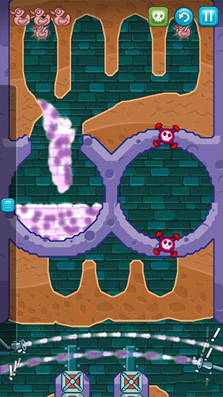 2、游戏中,有打水、泼水、溅水,还有引导水通过越来越难的场景,每一滴水都管用。在游戏过程中,玩家还需要发挥聪明才智,要小心藻类、有毒软泥,机关和各类陷阱。