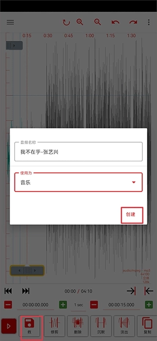 5、最后进行音频剪辑操作即可,修剪完成后点击保存,再点击创建就能完成保存