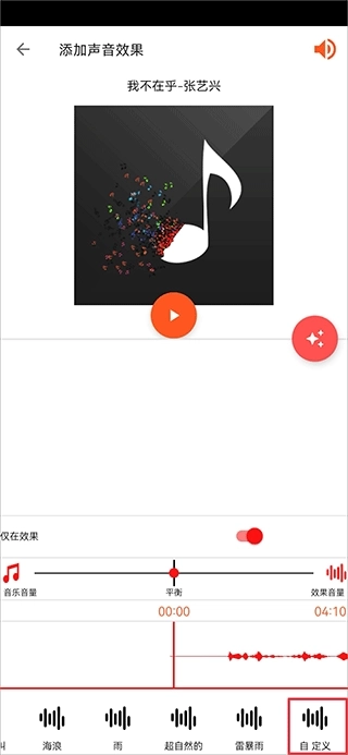 2、选择音频文件后,在添加声音效果界面中点击自定义(由于效果列表里没有水下效果,所以用户需要先在手机上安装一个水下效果)