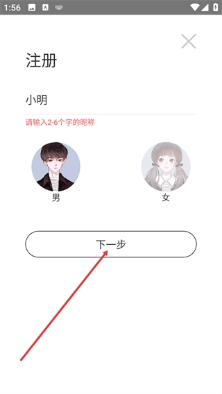 2、进入注册页面后,填写2至6字的昵称,选择性别(男/女),确认信息无误后点击“下一步”,继续推进注册流程。