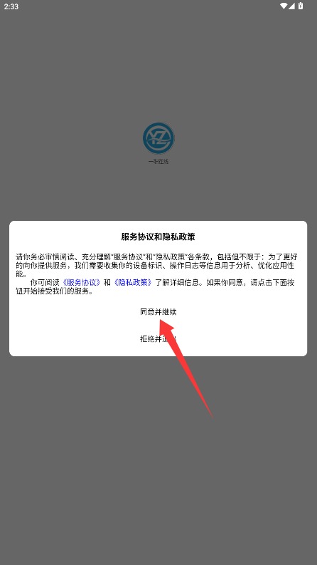 1、首次使用时,请仔细阅读平台的服务条款和隐私政策,在确认无误后,点击“同意并继续”按钮即可进入应用。