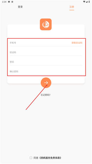 3、若选择注册,可切换至“注册”标签页,接着按顺序填写手机号、获取并输入验证码、设置密码与确认密码,之后点击箭头按钮,即可完成账号注册。