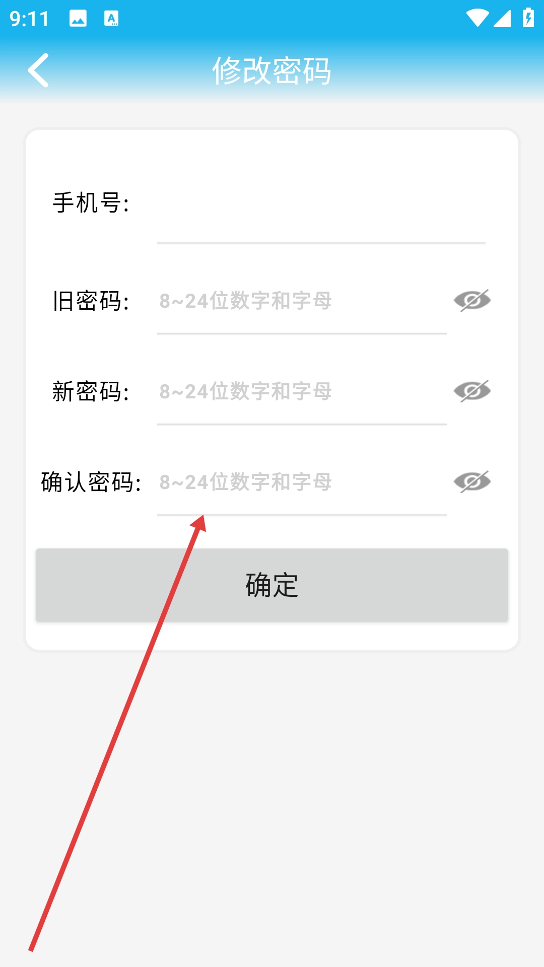 进入修改密码页面后,依次填写手机号、旧密码、新密码以及确认密码,随后点击【确定】按钮,即可完成密码的修改操作。