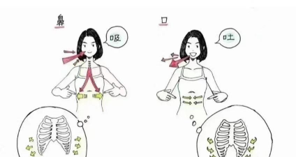 呼气时,用鼻腔缓缓地把气呼出去,腹部会自然地向内收,同时去感受横膈膜向上抬升。