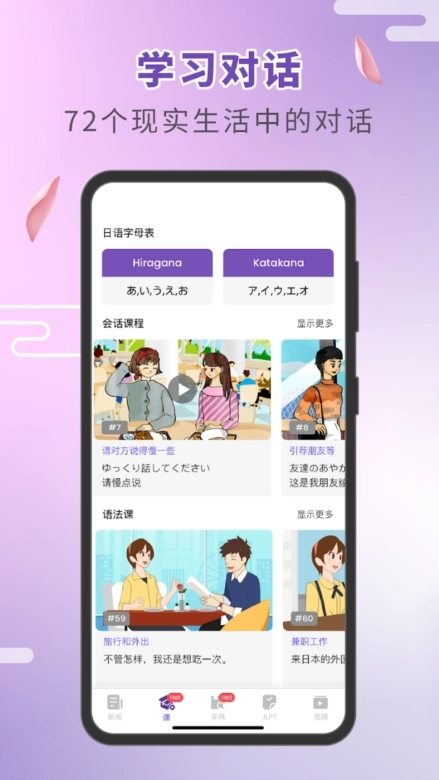 N5-N3阶段:按场景分类学习(如「餐厅点餐」「问路」),每完成一个场景后,用的「情景对话」功能模拟真实对话(如扮演顾客和店员角色)。