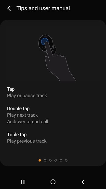 轻按:播放或暂停曲目。双击:播放下一首曲目。三次点击:播放上一首曲目。触摸并按住:您可以为每个耳机设置默认触摸选项,包括“Bixby”和“调低和调高音量”。