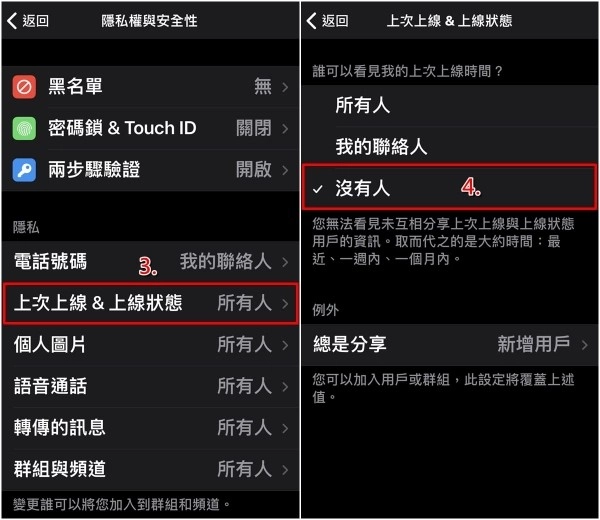 2、接下来请找到「上次上线&上线状态」的选项,然后在「谁可以看见我的上次上线时间」区域里,把原本默认的「所有人」调整为「没有人」。