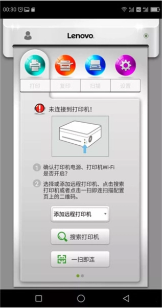 2、手机上打开小新打印软件会自动添加打印机,也可使用一扫即连扫描“打印配置页”上的二维码连接。