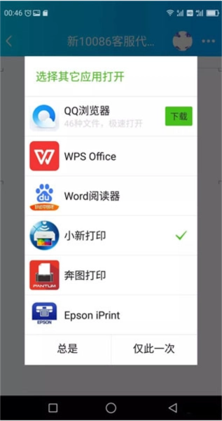 3、软件连接好打印机之后,我们就可以打印或QQ上的文件了,只需要对或QQ中收到的文件选择“用其他应用打开”。