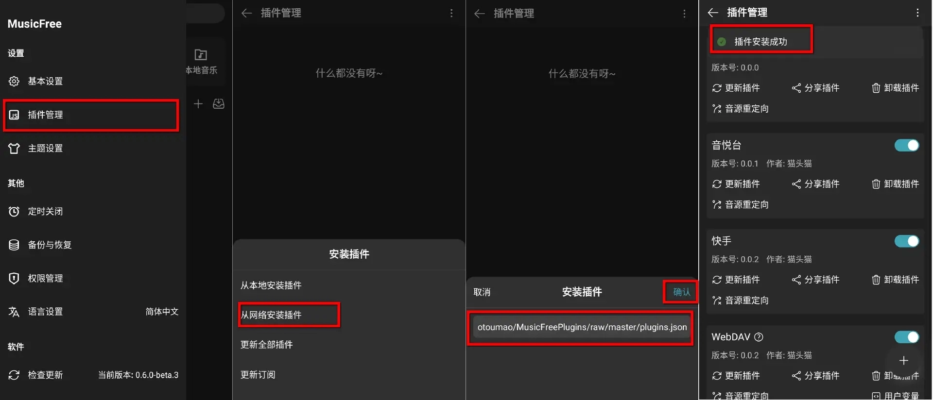 【设置】→【插件管理】→点击右下角的加号按钮→【通过网络安装插件】→填写音源地址→【确认】