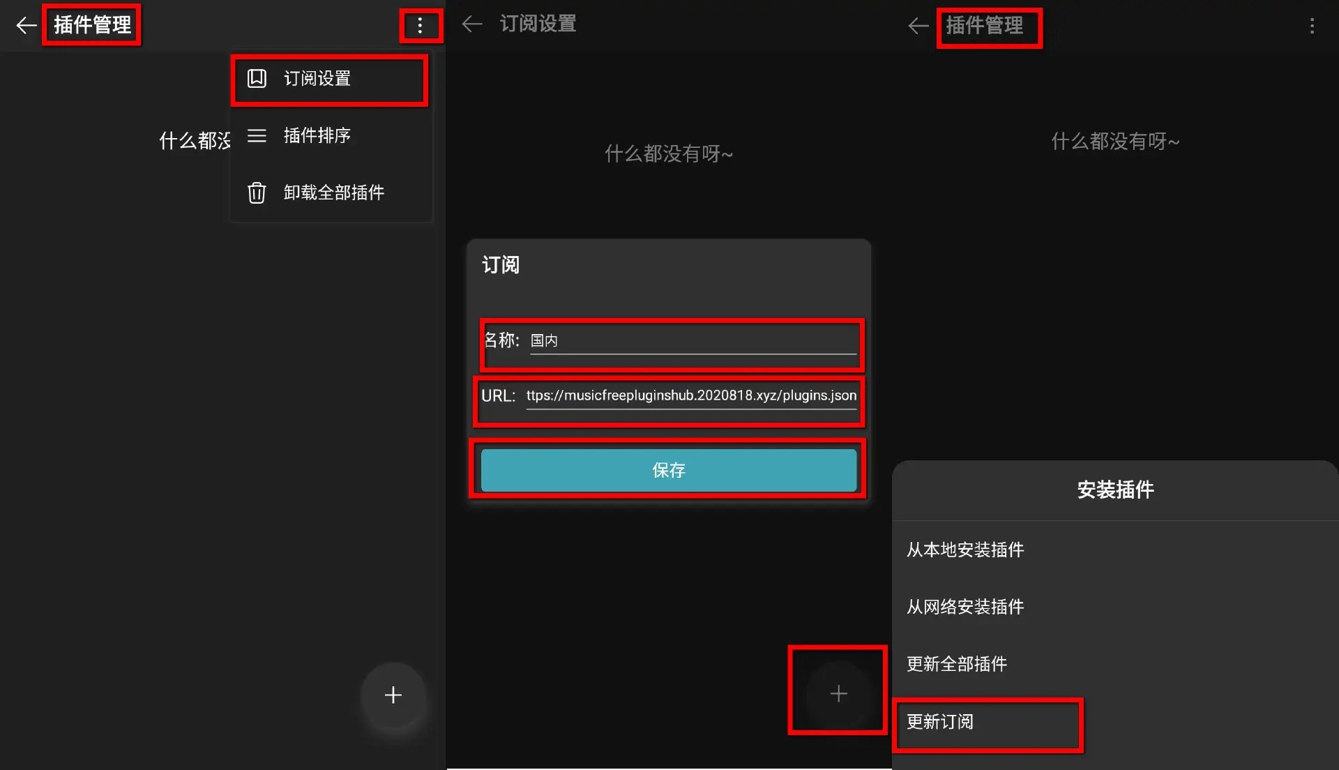 【设置】→【插件管理】→点击右上角三个点→【订阅设置】→点击右下角加号→输入名称→输入URL→【保存】→返回到插件管理页面→点击右下方加号→【更新订阅】